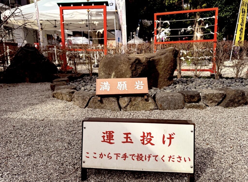 一個ずつ願いを込めて投げて、満願岩へ入れば