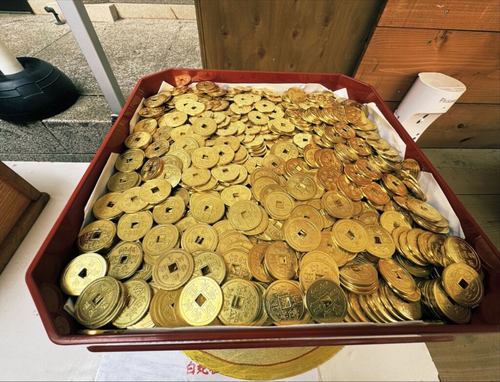ザルの中に、さきほどの白蛇種銭と自身の小銭をいれたら