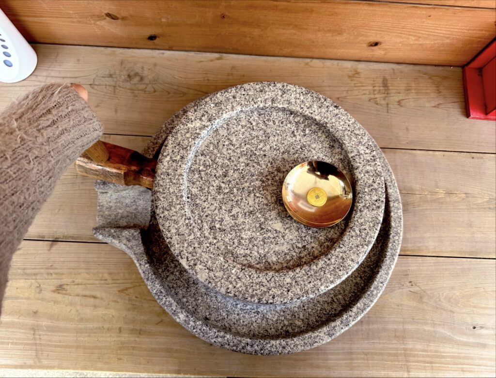 新しい白蛇種銭をいただき、こちらの石臼の金杯の上に乗せて↓