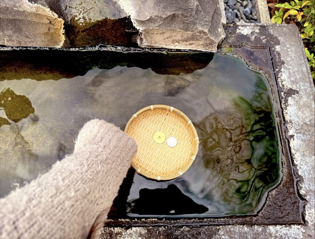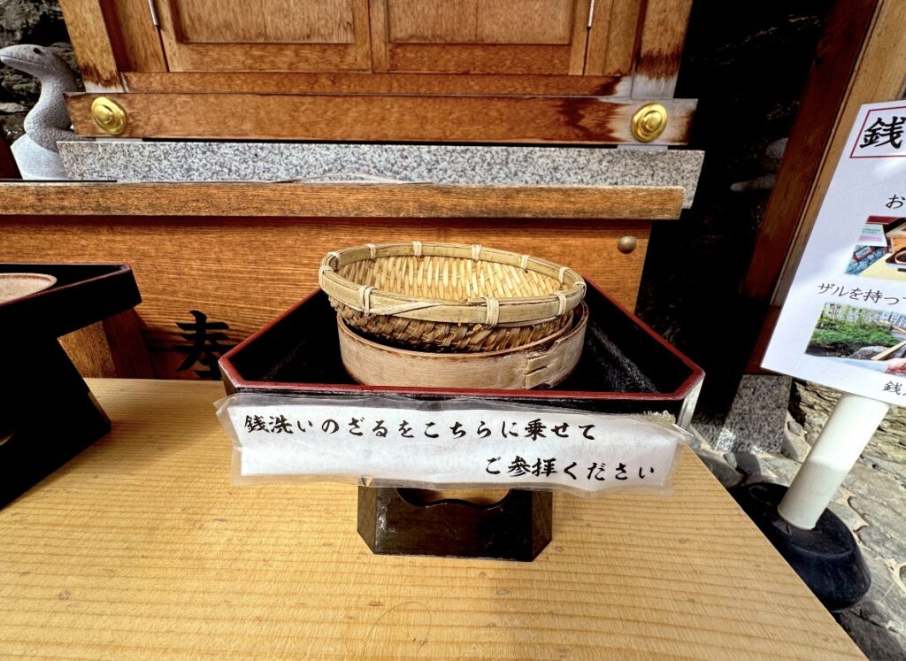 先ほど清めた小銭は、こちらにザルごと乗せられるので