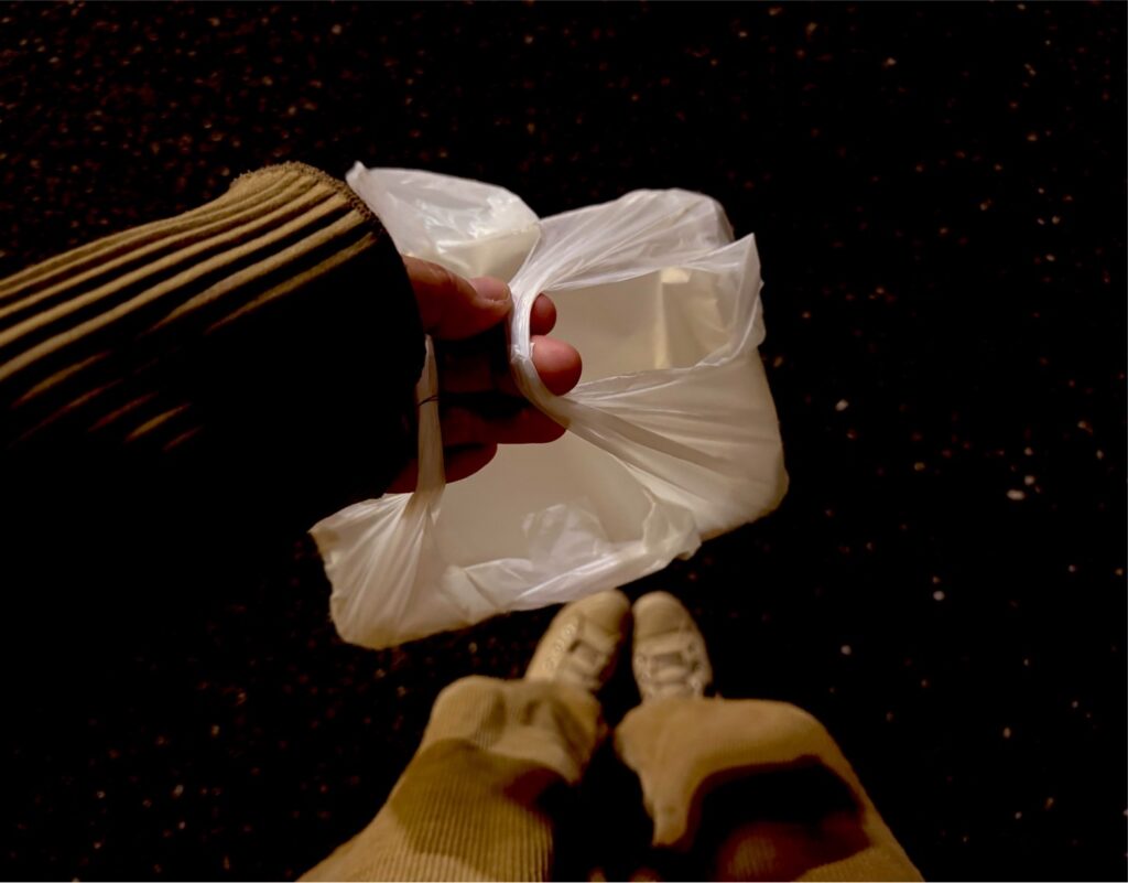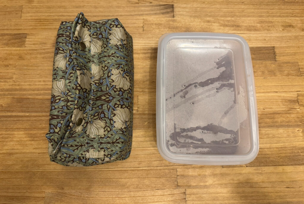 タッパーは汁が漏れないよう紙袋に包んで