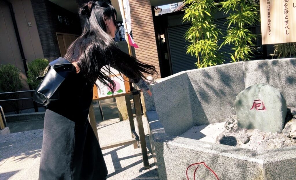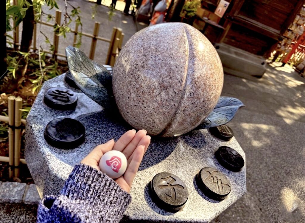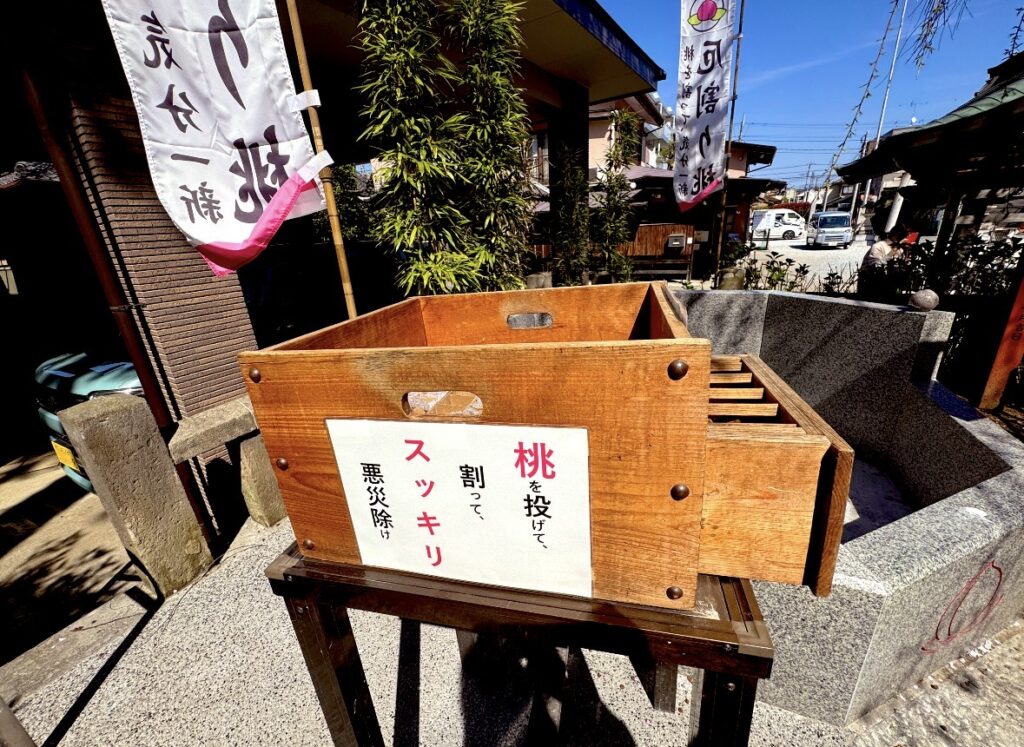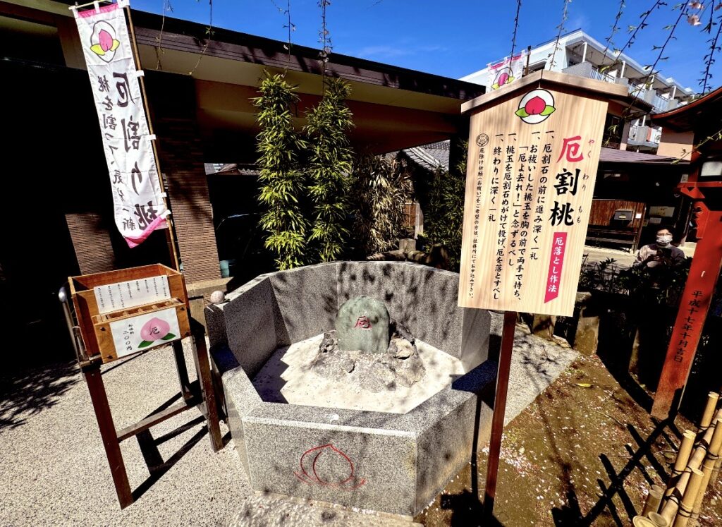 岩に、桃をぶつけて割る神社( 厄をわる )