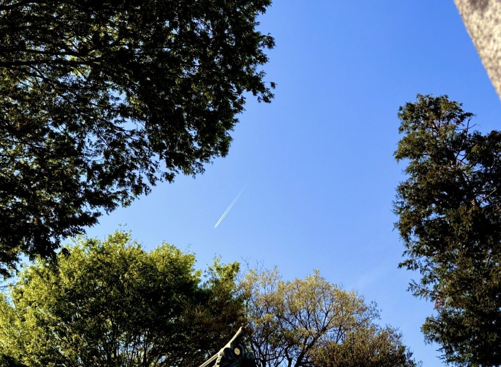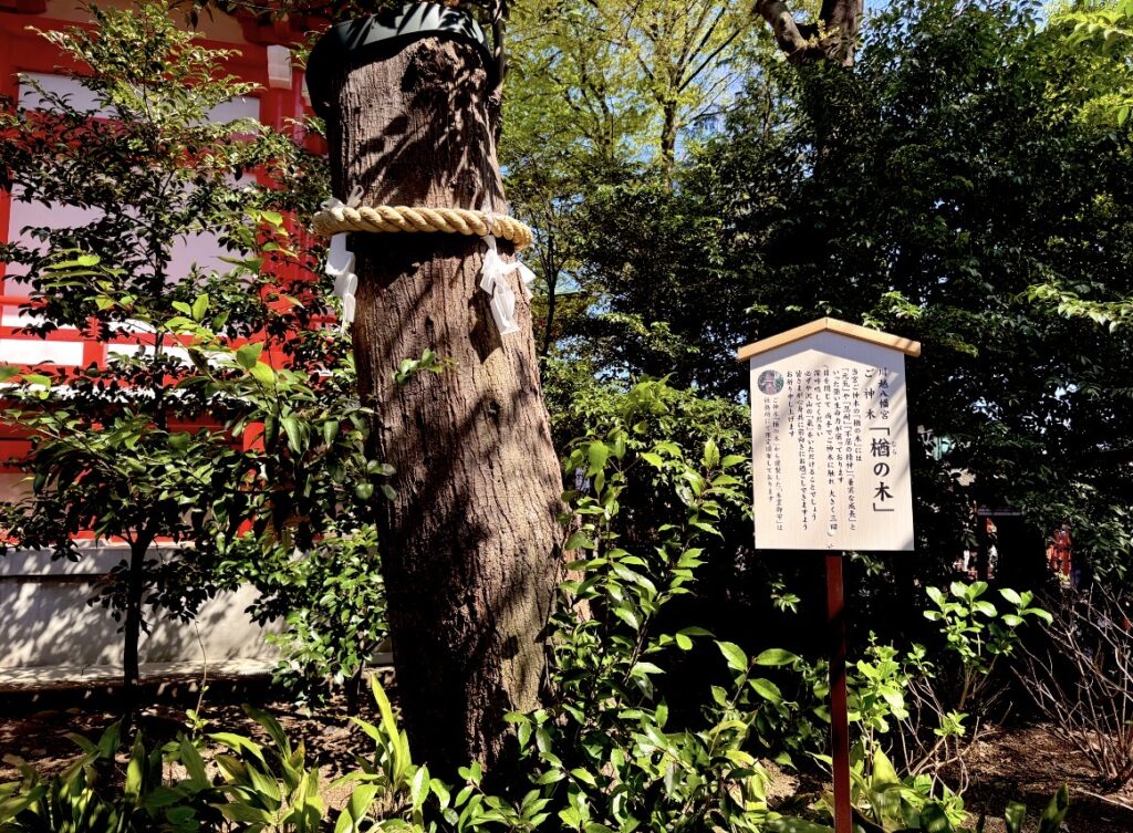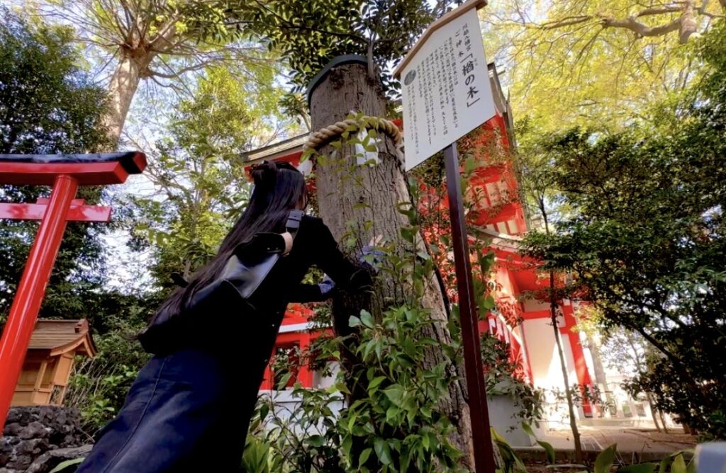 目を閉じて、両手で御神木にふれ、大きく3回深呼吸をする